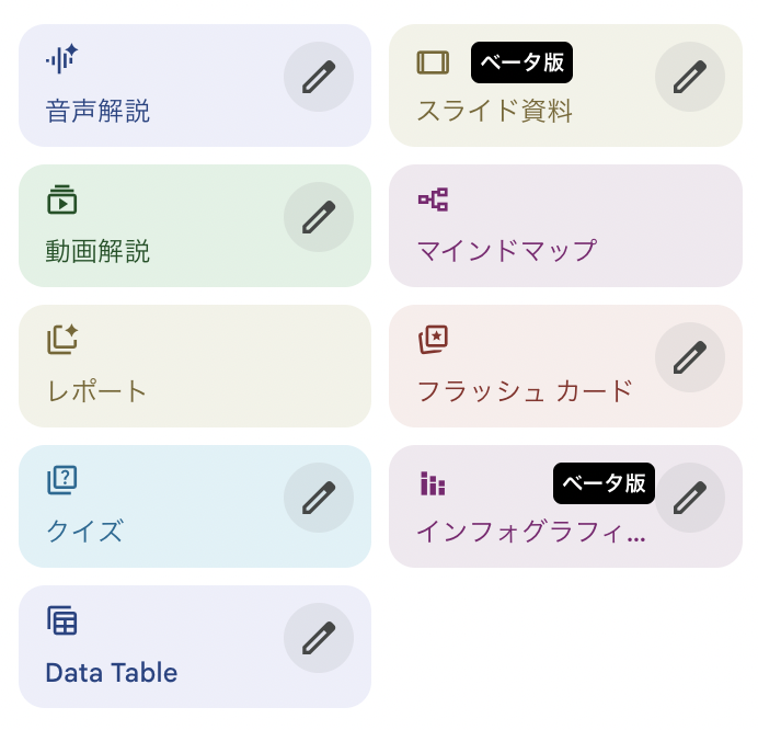 「Studio」には音声解説・スライド資料・動画解説・マインドマップ・レポート・フラッシュカード・クイズ・インフォグラフィック・Data Tableと、資料を様々な角度から解析するツールが揃っています。
