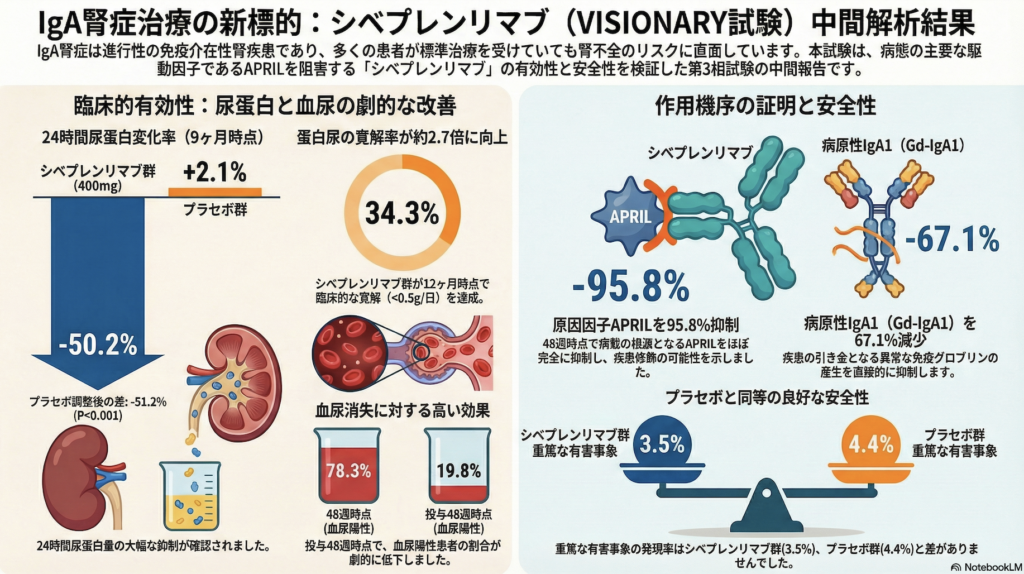 最近NEJMになんと中間解析の段階で発表されたIgA腎症へのsibeprenlimabのRCTについて、まとめてもらいました。わずか数分でこのクオリティで図解してくれます。Perkovic V, Trimarchi H, Tesar V, et al. Sibeprenlimab in IgA nephropathy – interim analysis of a phase 3 trial. N Engl J Med [Internet] 2025 [cited 2026 Feb 12];(NEJMoa2512133). Available from: http://dx.doi.org/10.1056/NEJMoa2512133