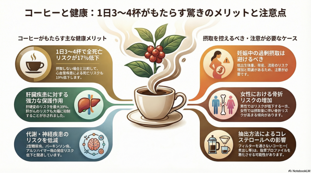 コーヒーと健康に関する論文のVisual AbstractをNotebookLMで作ってみました。Poole R, Kennedy OJ, Roderick P, Fallowfield JA, Hayes PC, Parkes J. Coffee consumption and health: umbrella review of meta-analyses of multiple health outcomes. BMJ 2017;359:j5024.